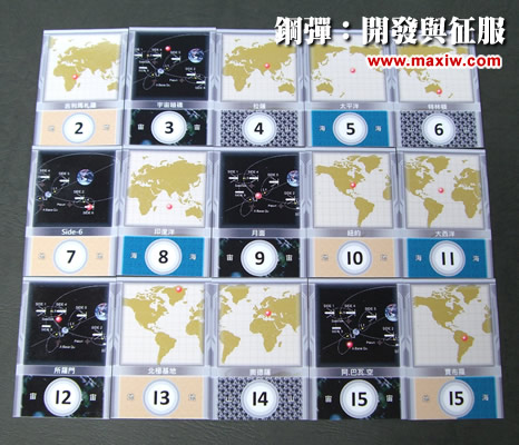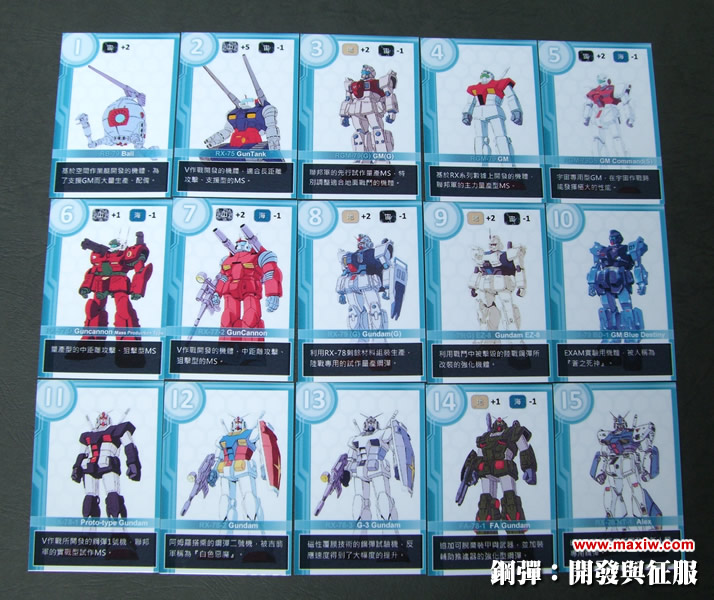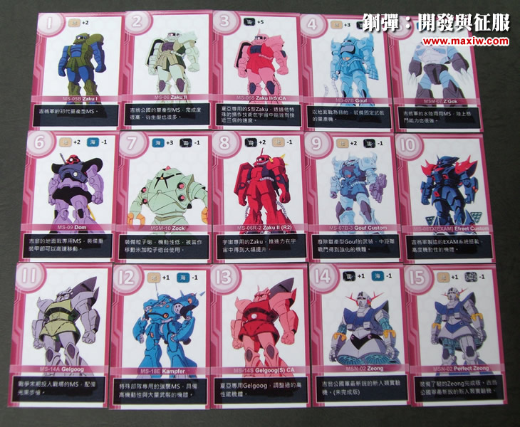 1. MS卡片30張 (如下圖1、2):面額 1 ~ 15 各兩張,每張上面的MS適應地形都有所不同。