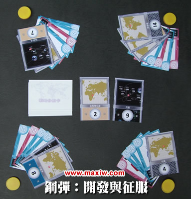 資金追加: 最初的玩家,必須先投入一個以上的開發資金,放在桌上靠近自己的地方,然後順時針換下一位玩家。
